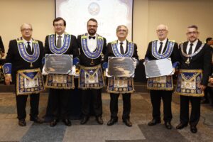 Ir. Cassiano Lhopes Moreno, PGM do GOBA e Secretário Geral da COMAB, Ir. Daniel Klay, Relações Exteriores da GLEB, Ir. Adrian Ramirez, Delegado do Grão-Mestre José Fernandes Zacur, da Gran Logia Simbólica de Paraguay e ,Ir. Leonardo Abreu Amorim Neves GM GOBA.